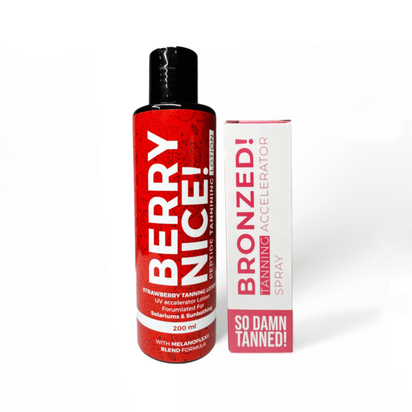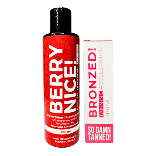 The Bronzed Berry Nice & Spray Duo Pack is a premium tanning bundle that combines a hydrating berry-scented tanning lotion with a powerful tanning spray. This duo is designed for those who want a long-lasting, golden tan with an extra boost of tanning acceleration.
