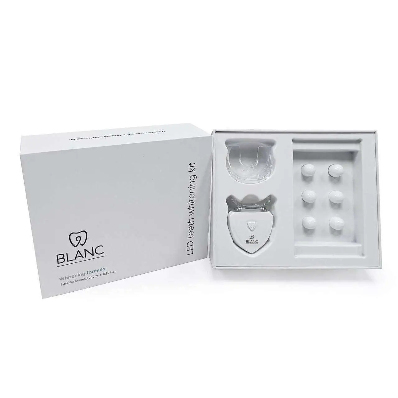 teeth whitening kit. Designed for comfort and ease, this kit includes an LED device and a peroxide-free whitening formula that guarantees worry-free results. Whether you’re looking for a quick touch-up or a complete transformation, our kit delivers noticeable results without irritation or sensitivity.